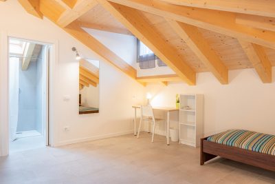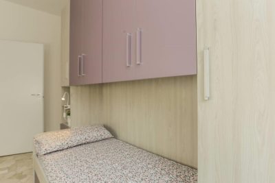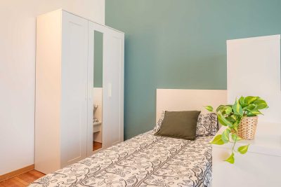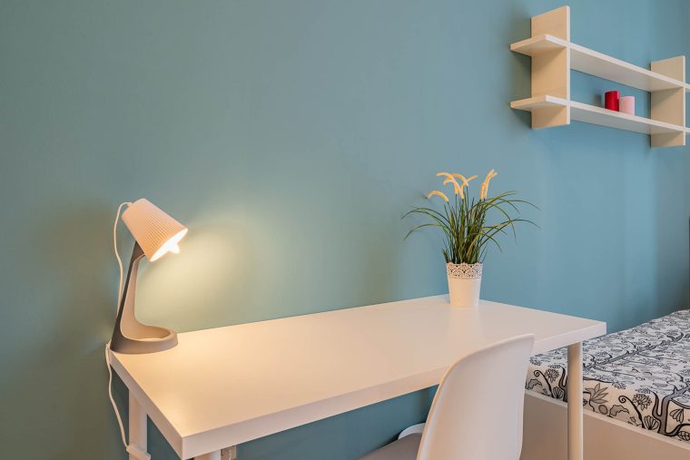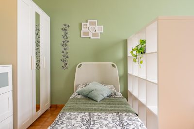 In an apartment located in viale Romolo 1, this shared room is reserved for university students, interns or young workers. Fully furnished, it is equipped with two single beds, each one with bedside table and lamp, two wardrobes, two bookcases, two desks and chairs.