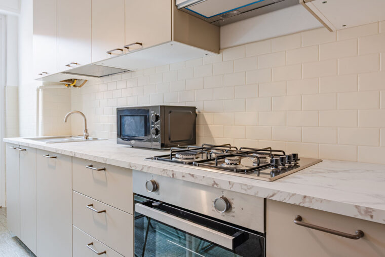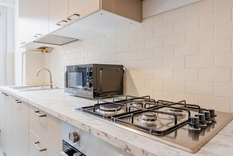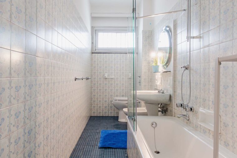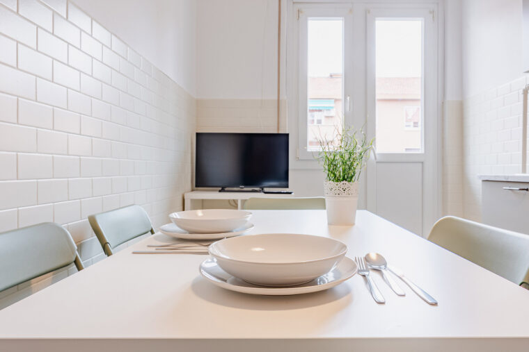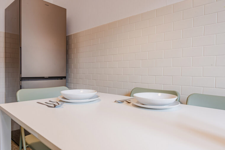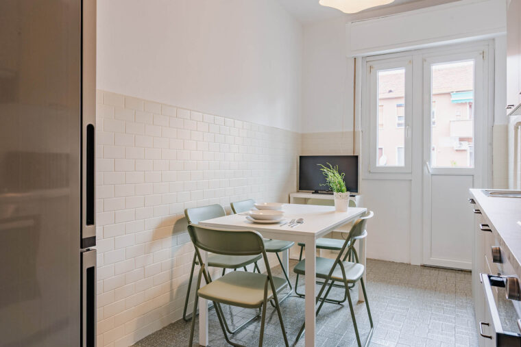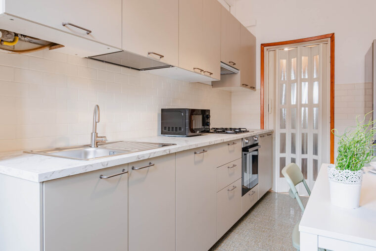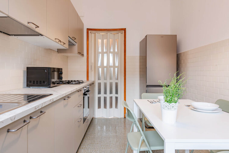 Cucina abitabile e due bagni in condivisione con gli altri inquilini dell’appartamento.