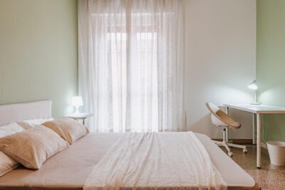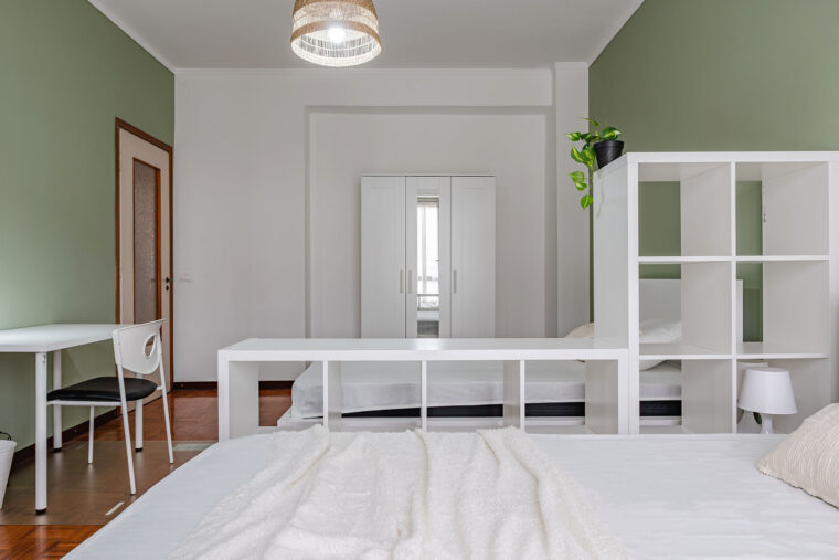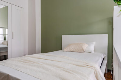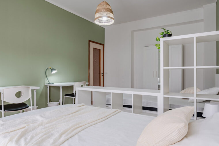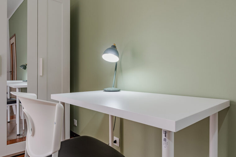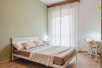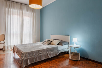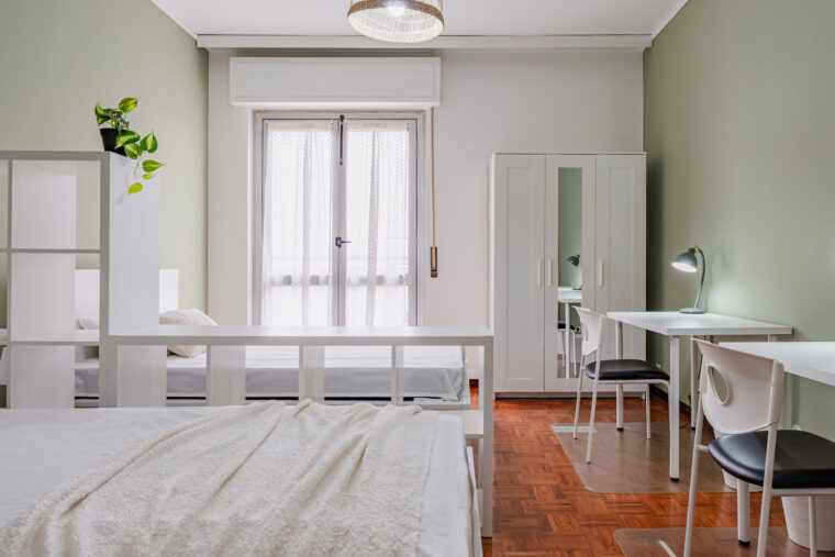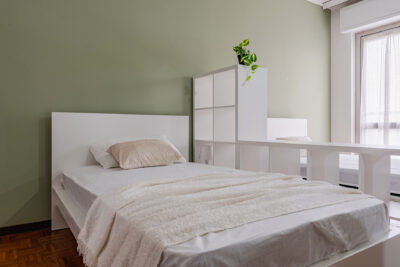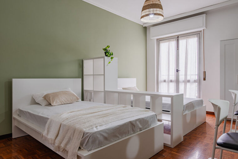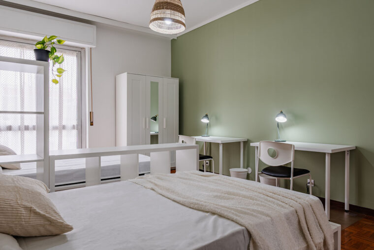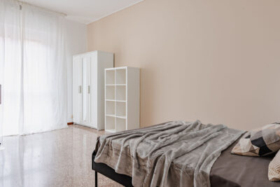 In un appartamento sito in via Privata Assab 15, questa stanza doppia è riservata a giovani lavoratori o stagisti. Completamente arredata e corredata, è dotata di due letti individuali, ciascuno con proprio comodino con abat jour, due armadi individuali a doppia anta, due scrivanie, due librerie e sedie.
