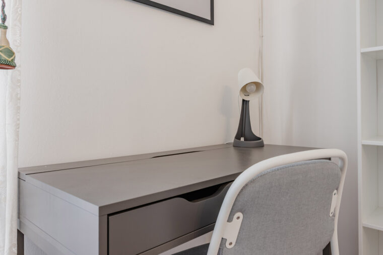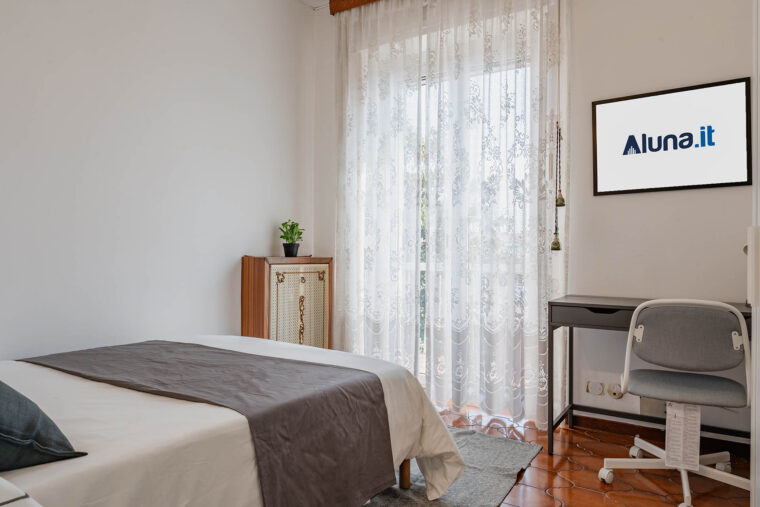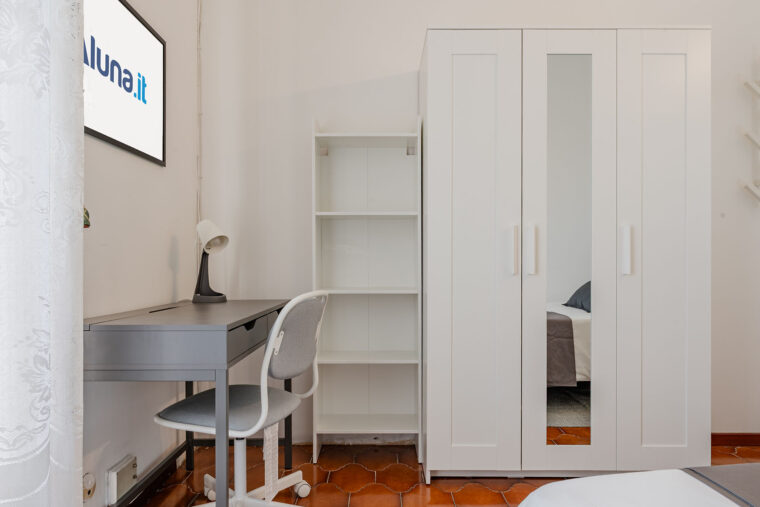 In un appartamento sito in via Cabella 43, questa stanza singola è riservata a giovani lavoratori o stagisti. Completamente arredata e corredata, è dotata di letto ad una piazza e mezza, comodino con abat jour, armadio individuale a doppia anta, scrivania, libreria e sedia.