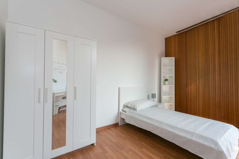 In un appartamento sito in via Gavirate 27, questa stanza singola è riservata a studenti universitari, stagisti o giovani lavoratori. Completamente arredata e corredata, è dotata di letto singolo, comodino con abat jour, armadio individuale a doppia anta, scrivania, libreria e sedia.