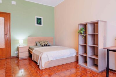 In un appartamento sito in via Privata Giovanni Meli 18, questa stanza doppia è riservata a studenti universitari, stagisti o giovani lavoratori. Completamente arredata e corredata, è dotata di due letti individuali, ciascuno con comodino e abat jour, due armadi individuali a doppia anta, due scrivanie, due librerie e due sedie.