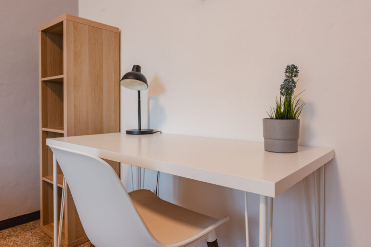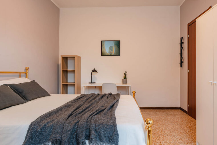 In un appartamento sito in via Sem Benelli 14, questa stanza singola è riservata a giovani lavoratori o stagisti. Completamente arredata e corredata, è dotata di letto ad una piazza e mezza, comodino con abat jour, armadio individuale a doppia anta, scrivania, libreria e sedia.